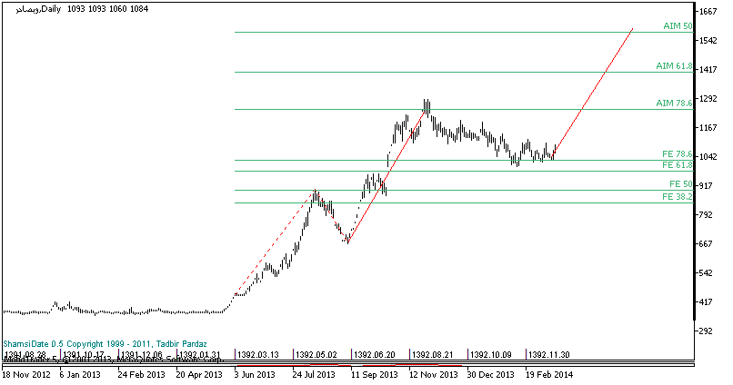 از سویی با در نظر گرفتن بازه ی زمانی طولانی مدت تر از - از تاریخ خرداد 92 - و اعمال فیبو اکسپنشن و اصلاح قیمت در تاریخ مرداد 92 انتظار رشدی مشابه در قیمت تا حد 1600 ریال می رود.