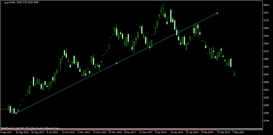 همانم طور که در تصویر زیر مشاهده می شود خط روند صعودی این سهم در میانه ی دی ماه سال 92 شکسته شده و پس از پول بک در قیمت 360 ریال به مقاومت تبدیل شده است.