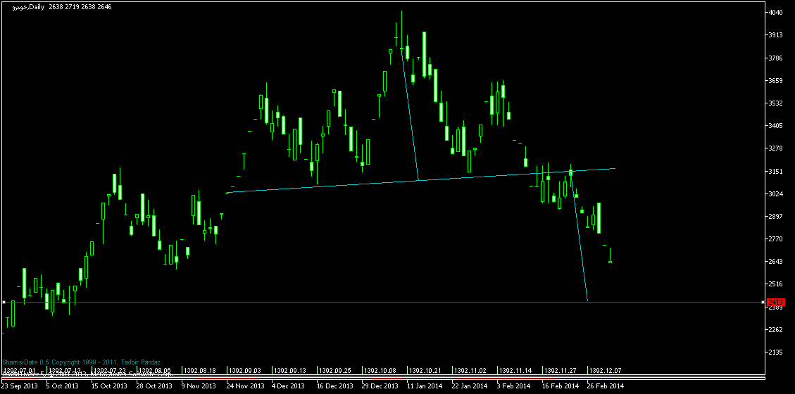 همان طور که در تصویر نیز مشاهده می شود با تشکیل الگوی سر و شانه انتظار می رود که این سهم با ادامه ی روند نزولی تا حدود کمتر یک ماه آتی به قیمت 2413 ریال برسد.