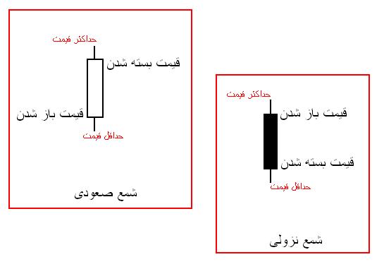 در این نمودار از الگویی به نام شمع استفاده می شود.دو نوع شمع وجود دارد - صعودی و نزولی- که هر شمع،دارای چهار قسمت است.