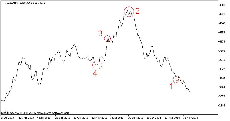 برای مثال در تصویر زیر که مربوط به نماد فملی است نقاط 2 و 4 پیوت ماژرو و نقاط 1 و 3 پیوت مینور هستند.